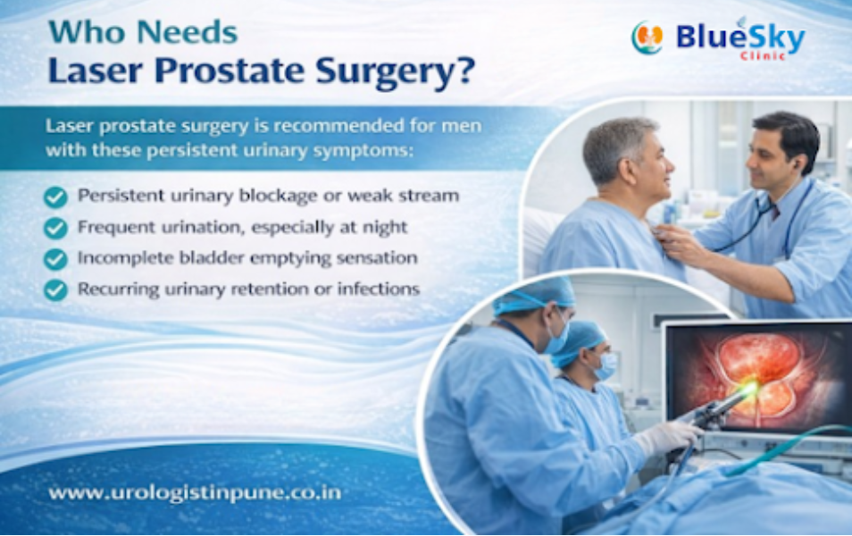 Laser prostate surgery is recommended for men experiencing persistent urinary difficulties due to prostate enlargement, such as weak urine flow, frequent urination at night, incomplete bladder emptying, or repeated infections. In many such cases, Laser prostate surgery in Pimpri Chinchwad becomes an important step when medications fail to control symptoms and daily comfort is affected.